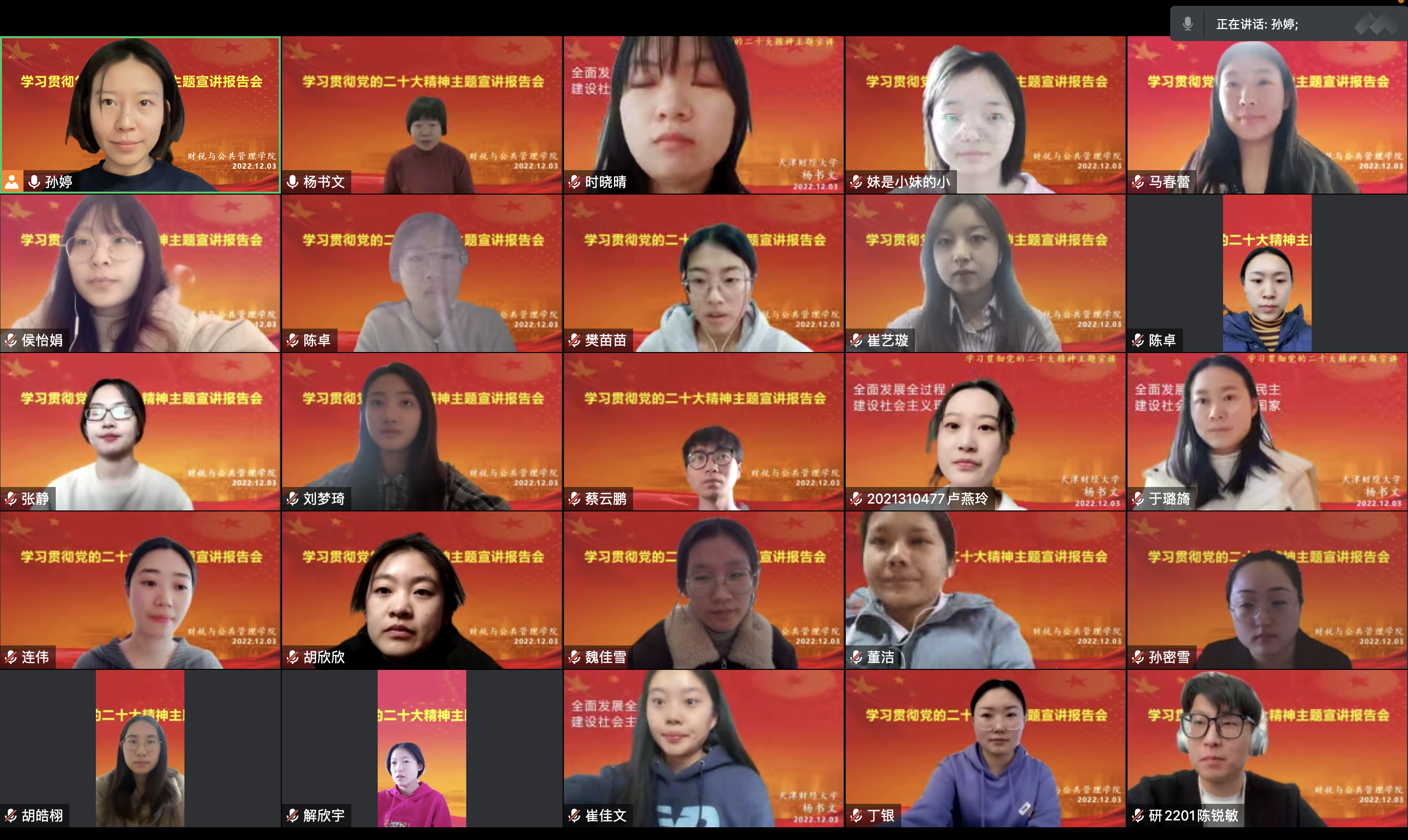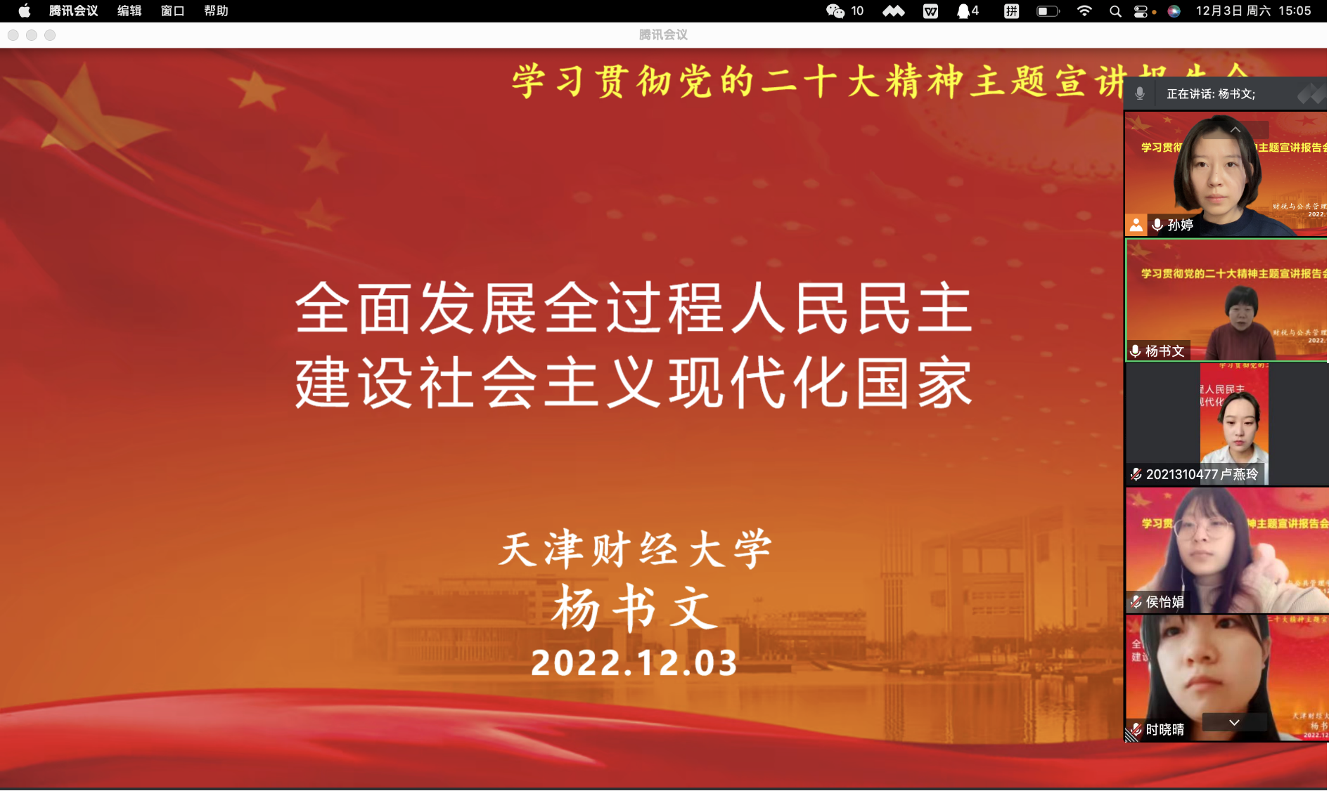 12月3日下午,188博金宝亚洲体育公管专业研究生党支部以线上会议的方式开展学习贯彻党的二十大精神主题宣讲报告会。学院副院长杨书文教授应邀为支部党员做了“全面发展全过程人民民主,建设社会主义现代化国家”的专题报告。本次宣讲大会由支部书记孙婷主持,公管专业研究生党支部全体党员全程参与并聆听。