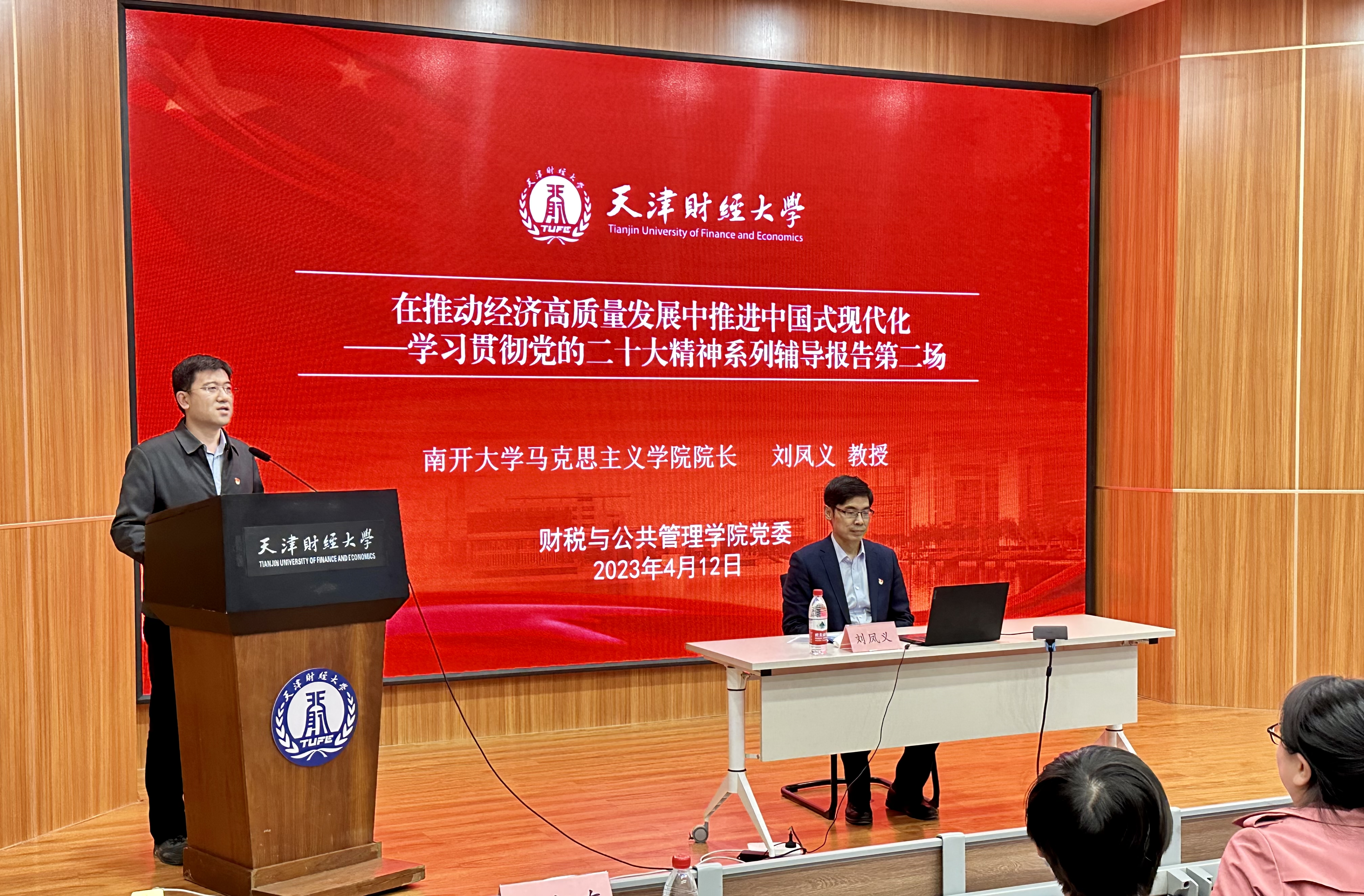 4月12日,188博金宝亚洲体育在Z001举办“学习贯彻党的二十大精神系列辅导报告”第二场,邀请了南开大学马克思主义学院院长刘凤义教授开展主题为“在推动经济高质量发展中推进中国式现代化”的讲座,188博金宝亚洲体育党委书记、院长陈旭东教授主持,学院党员师生代表参加此次讲座。