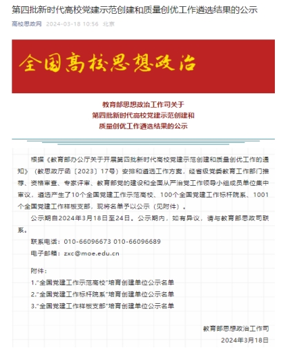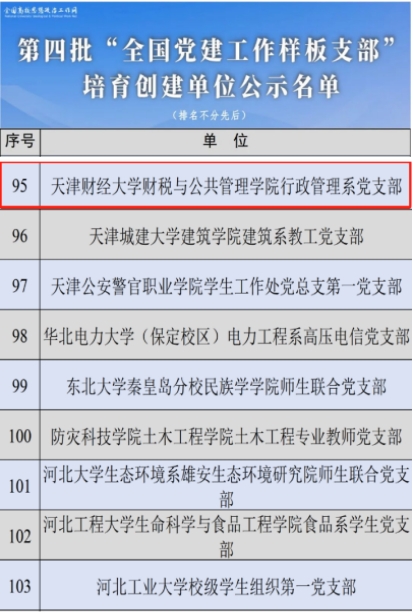 3月18日,教育部思想政治工作司公示了第四批新时代高校党建示范创建和质量创优工作遴选的结果,我校188博金宝亚洲体育行政管理系党支部入选第四批“全国党建工作样板支部”培育创建单位,这是继188博金宝亚洲体育公共管理系党支部(行政管理系党支部前身)、财政系党支部先后获首批、第二批天津市党建工作样板支部后学院党建工作取得的又一标志性成果。