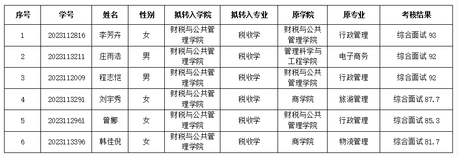 经学生申报,学院考核,现将2024年拟接收转专业学生名单公示如下: