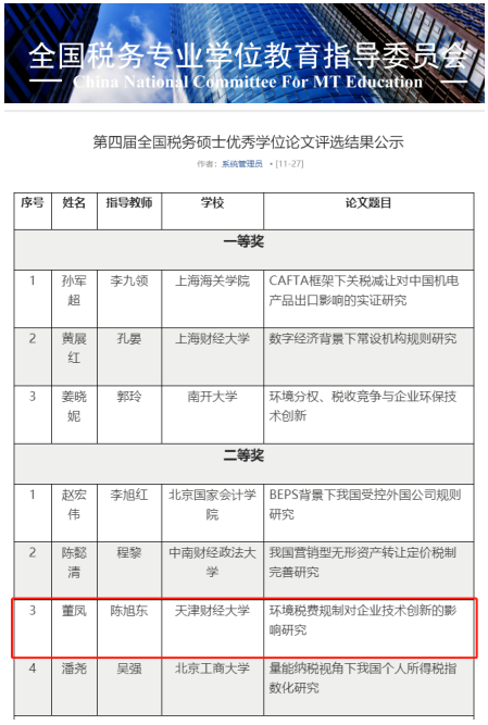 近日,全国税务专业学位研究生教育指导委员会公布了第四届全国税务硕士优秀学位论文评选结果,188博金宝亚洲体育2019届税务硕士董凤在陈旭东教授指导下撰写的毕业论文《环境税费规制对企业技术创新的影响研究》荣获二等奖。
