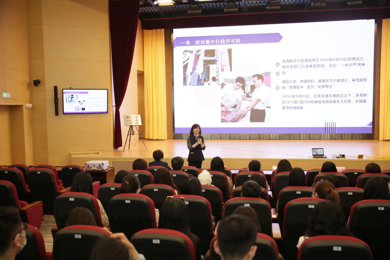 滨海新区政务服务办公室党组书记、主任徐斐博士以“打造一流营商环境,促进滨海新区高质量发展”为题,为188博金宝亚洲体育师生做了一场生动的报告。她不仅讲述了滨海新区行政审批制度改革历程,还重点分析了近年来滨海新区开展的以“一企一证”为代表的综合改革的思路及具体措施。