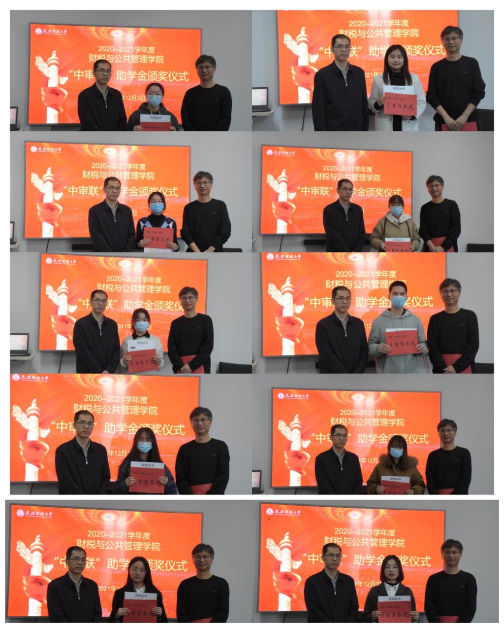 颁奖仪式中,王铁松总经理逐一向10名中审联助学金获得学生颁发荣誉证书,并鼓励每一位同学努力奋斗。颁奖仪式结束,与会人员合影留念。