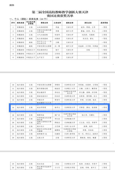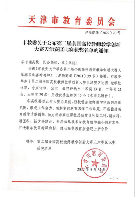 近日,天津市教委发布了《市教委关于公布第二届全国教师教学创新大赛天津赛区比赛获奖名单的通知》(津教高涵2022【20】号),188博金宝亚洲体育杨书文教授获得正高组二等奖,团队成员包括闫章荟、唐权、张丽颖。