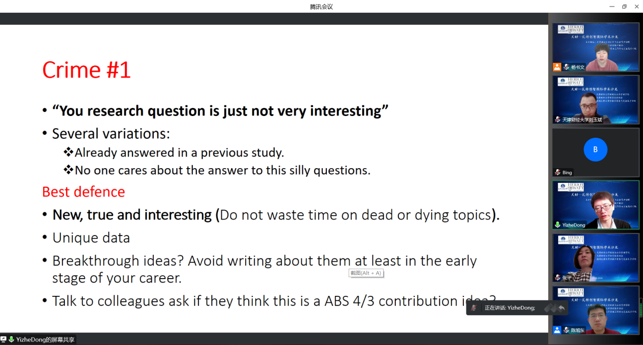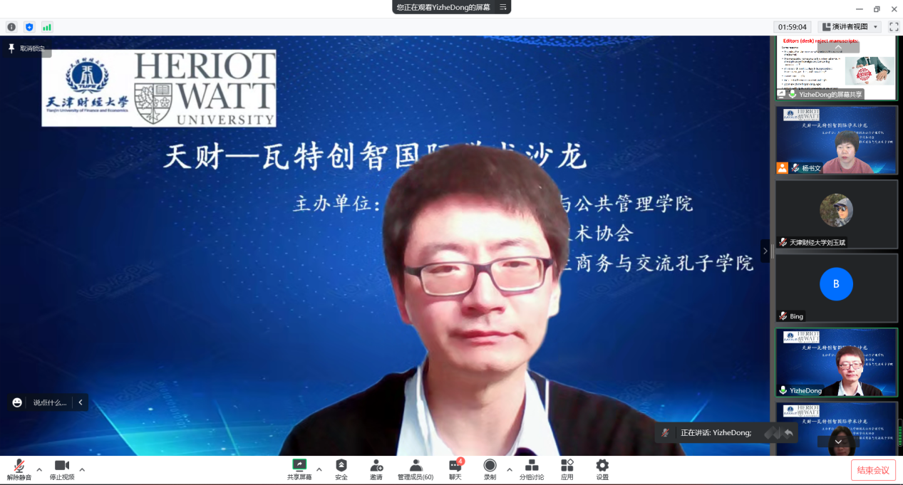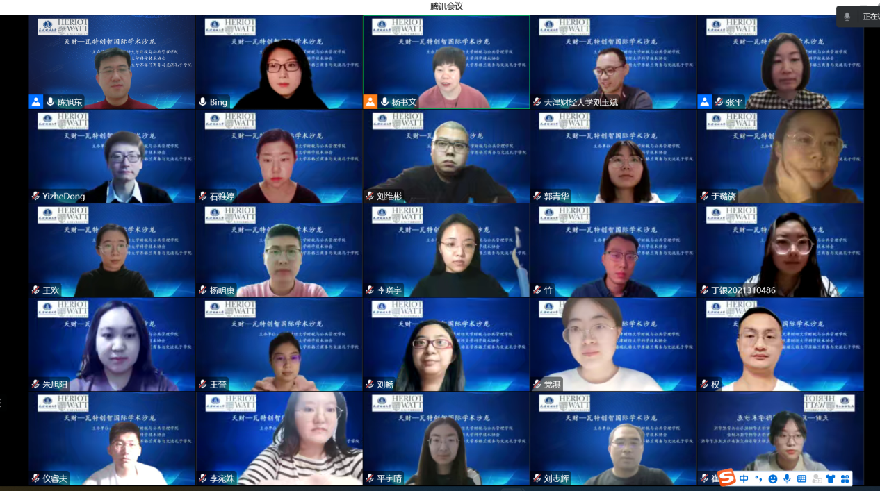 2022年12月9日,由188博金宝亚洲体育、天津财经大学科学技术协会、赫瑞瓦特大学苏格兰商务与交流孔子学院共同主办的“天财—瓦特创智国际学术沙龙”成功举行。本次沙龙以腾讯会议线上方式进行,由天津财经大学—英国赫瑞瓦特大学苏格兰商务与交流孔子学院中方院长张平教授主持,邀请了英国赫瑞瓦特大学徐冰教授和英国爱丁堡大学董轶哲副教授分别作了精彩的分享,并与师生进行了互动交流。参会的还有188博金宝亚洲体育陈旭东院长、杨书文副院长、科研处刘玉斌副处长等部分教师和研究生70余人。