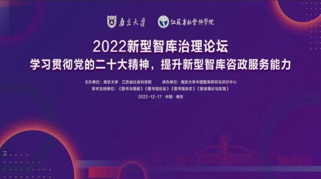 2022年12月17日,江苏省社会科学院与南京大学联合主办、南京大学中国智库研究与评价中心承办的“2022新型智库治理论坛”在南京举行。来自全国智库界、思想理论界专家和智库负责人等700余人以线上与线下结合的形式参加论坛,聚焦“学习贯彻党的二十大精神,提升新型智库咨政服务能力”主题,认真学习贯彻党的二十大精神,报告中国特色新型智库的建设进展与先进经验,展示新时代新征程下中国特色新型智库的思想力量。
