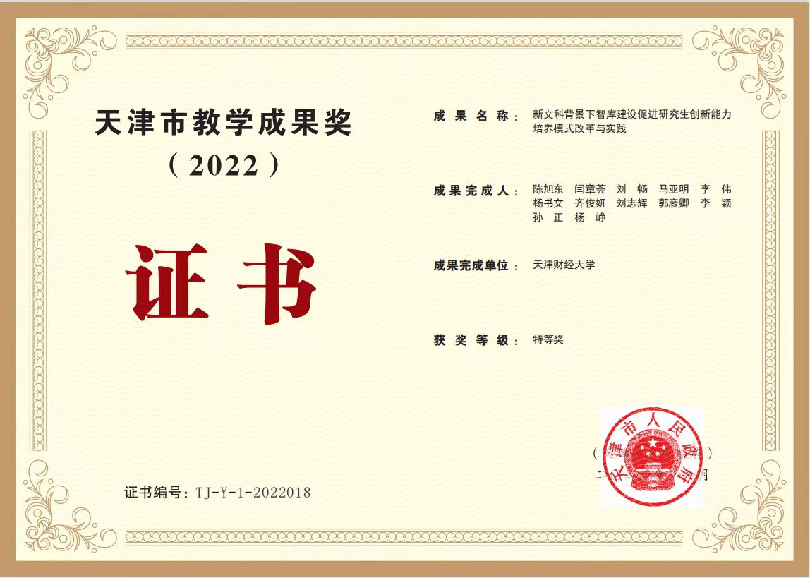 188博金宝亚洲体育牵头申报的教学成果《新文科背景下智库建设促进研究生创新能力培养模式改革与实践》喜获天津市教学成果奖特等奖(研究生),实现了学校市级教学成果奖的新突破。据悉,此次天津市高等教育教学成果奖励工作首次将研究生教学成果奖单列评选,全市共评选出高等教育(研究生)市级教学成果93项,其中特等奖30项、一等奖30项、二等奖33项。教学成果奖是天津市人民政府为了奖励取得教学成果的集体和个人,鼓励教育工作者从事教育教学研究,提高教学水平和教育质量而设立的最高级别奖励。