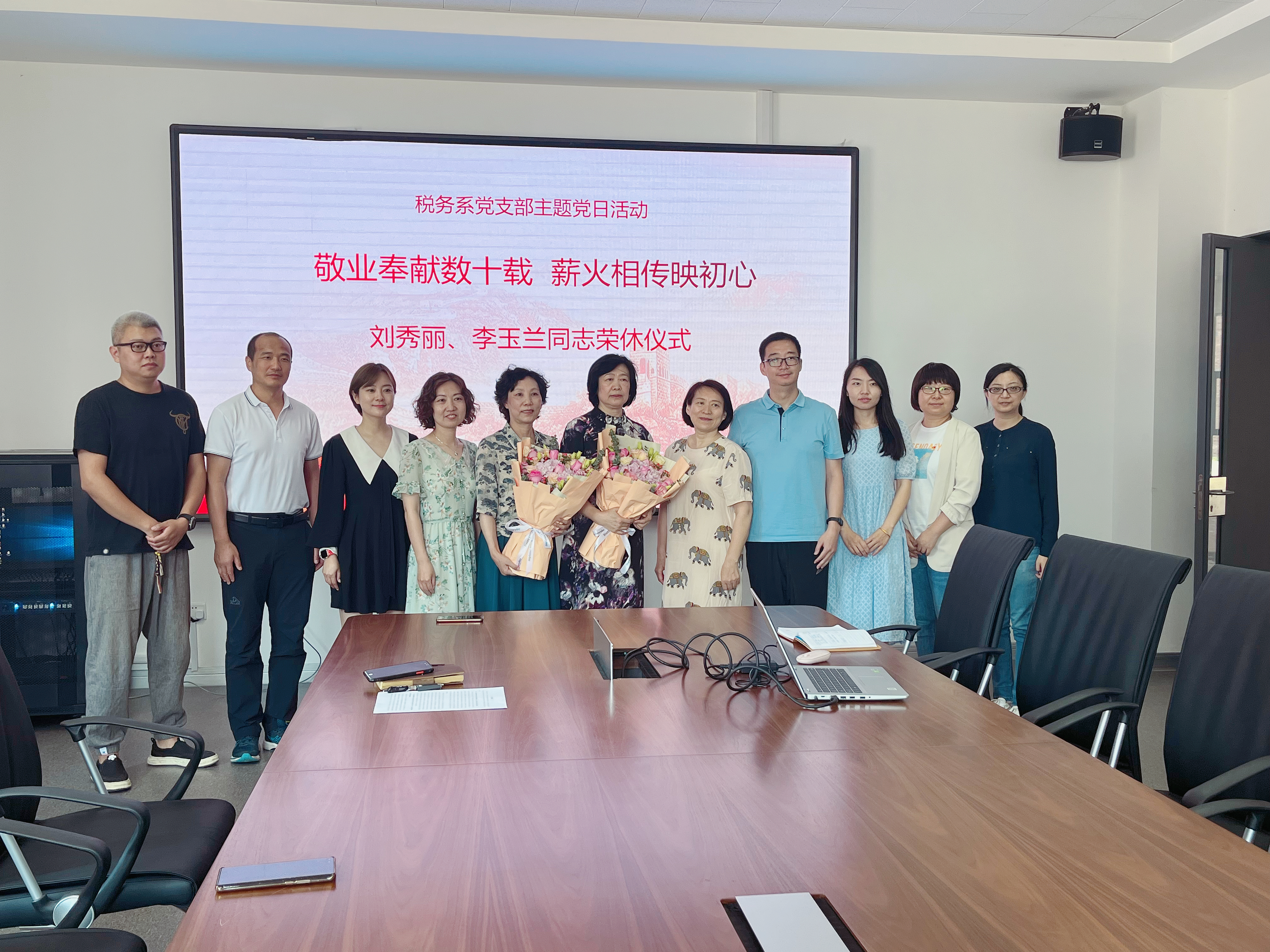 近日,税务系党支部召开了《敬业奉献数十载 薪火相传映初心》主题党日活动,为刘秀丽和李玉兰两位老教师举办荣休仪式。