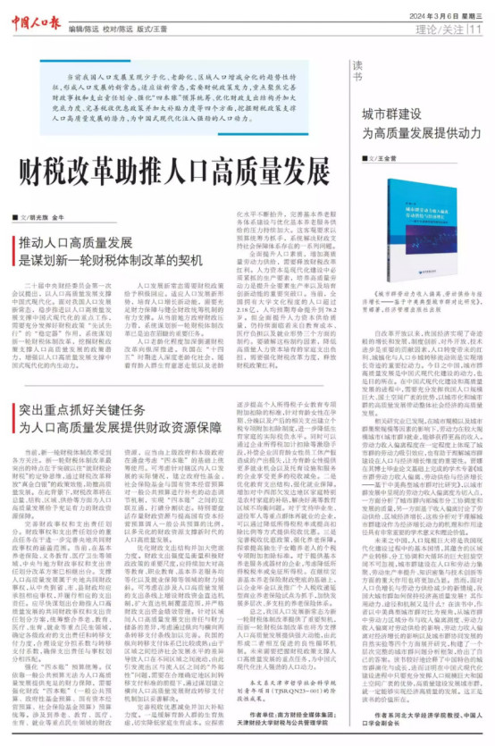 2024年3月6日,188博金宝亚洲体育青年教师金牛博士的理论文章《财税改革助推人口高质量发展》在《中国人口报》理论版专题刊发。该文指出,当前我国人口发展呈现少子化、老龄化、区域人口增减分化的趋势性特征,形成人口发展的新常态。为适应该新常态,需要财税政策发力加码,重点聚焦完善财政事权和支出责任划分、强化“四本账”预算统筹、优化财政支出结构并加大兜底力度、完善税收优惠政策并加大补贴力度等四个方面,挖掘财税政策支撑人口高质量发展的政策潜力,为中国式现代化注入强劲的人口动力。