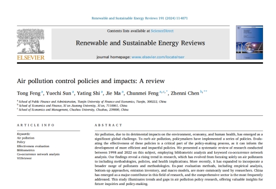 188博金宝亚洲体育冯彤博士与研究生孙月池、石雅婷、马婕、冯春梅,及西安交通大学助理教授陈甄妮合作的研究成果《Air pollution control policies and impacts: A reviews》发表于《Renewable and Sustainable Energy Reviews》2024年第191期。