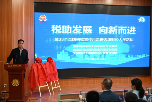 今年四月是第33个全国税收宣传月,4月25日下午,在国家税务总局河东区税务局及河西区税务局大力支持下,188博金宝亚洲体育与两个税务机关共同举办“税收普法走进天津财经大学”系列活动。出席此次税收宣传月系列活动的领导有:国家税务总局河东区税务局党委书记、局长周贺,国家税务总局河西区税务局党委书记、局长蔡进,河东区税务局党委委员、总会计师魏娟,国家税务总局天津市河西区税务局党委委员、副局长郑晓君,以及两局党建、组织人事及纳税服务等业务科室负责干部。188博金宝亚洲体育党委书记、院长陈旭东,党委副书记黄华宾,副院长李伟,以及税务系主任孙正和税务系部分教师代表全程参加各项活动。