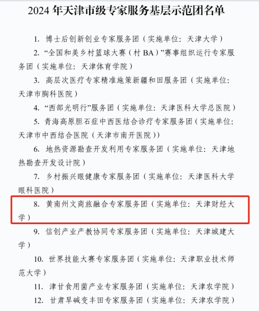 近日,天津市人力资源与社会保障发布了2024年专家服务团和国家级专家服务基地名单的通知,由188博金宝亚洲体育联合商学院共同申报的“青海省黄南州同仁市文商旅融合发展专家服务团”,成功入选2024年天津市级专家服务基层示范团。