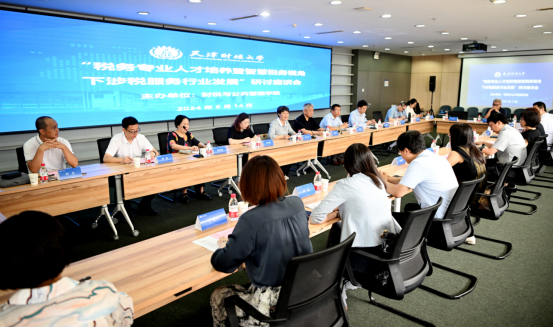 在涉税服务人才培养与就业供需洽谈阶段,致通振业(天津)税务师事务所有限公司所长杨津琪、国融兴华税务师事务所有限责任公司代表崔莉华、京洲联信(天津)税务师事务所有限公司所长张坤、立信税务师事务所(天津)有限公司执行董事张楠、中汇(天津)税务师事务所有限公司所长陈欣、中金税英特(天津)税务师事务所有限责任公司所长邢艳萍、上海德勤税务师事务所有限公司天津分所总监刘莉、天津睿和税务师事务所有限公司所长周睿、天津天扬君合税务师事务所有限责任公司所长张姝等九位企业家在充分肯定我校人才培养质量的基础上,聚焦基本技能、综合素质以及成长机制,对税收专业的课程设置、教学模式以及实践方式提出了非常有价值的建议。在智慧税务背景下涉税服务行业发展的研讨阶段,与会实务界专家结合人工智能蓬勃发展的背景,针对如何实现涉税信息的数字处理、涉税资料的高效整理以及涉税数据的安全管理,继而始终保持涉税服务行业竞争力等问题充分交换了意见。