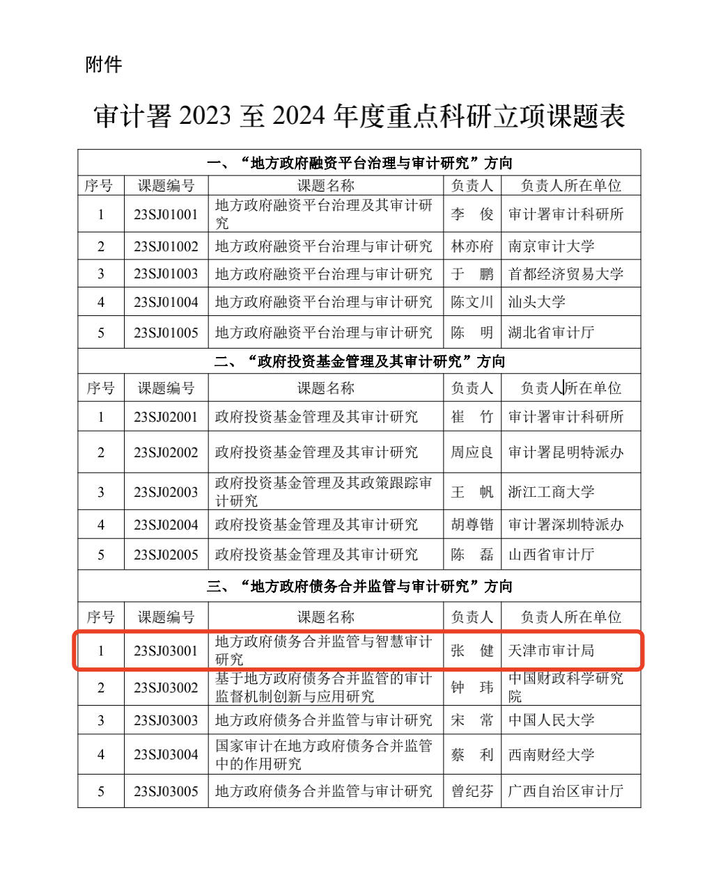2023年3月,学院与天津市审计局、云账户(天津)共享经济信息咨询有限公司共同开展“地方政府债务合并监管与智慧审计研究”主题的合作研究,三方充分发挥各自的研究实力和优势,共同申报并获批审计署2023至2024年度重点科研课题(全国申请83项获批15项)。为期一年多的研究中,学院科研团队紧密合作,围绕课题研究开展深入调研,与财政部政府债务评估与研究中心、天津市财政局等部门进行座谈研讨,并分别赴陕西、河北、贵州等地与当地审计厅、财政局、高校及科研院所就合并监管与智慧审计进行专题调研。在有组织科研中充分锻炼了研究队伍,培养了研究生,加强了学院财政风险及债务研究方向的传统优势,也得到了天津市审计局的充分肯定。