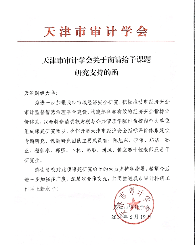 2024年6月,受天津市审计局的委托,188博金宝亚洲体育牵头组织,联合我校统计学院、金融学院、商学院等十余位科研骨干教师,组建专家研究团队,开展有关经济安全风险预警指标体系的专题研究,积极推动建设审计监督智慧治理平台,助力全市经济安全审计监督治理中心的组建设立。此后,与天津市审计局、审计学会、审计科研所等部门召开多次线上线下课题研讨会,分别从财政安全、金融安全、外贸安全、产业安全等十个维度开展经济安全预警的深入研究,目前已经取得阶段性成果。