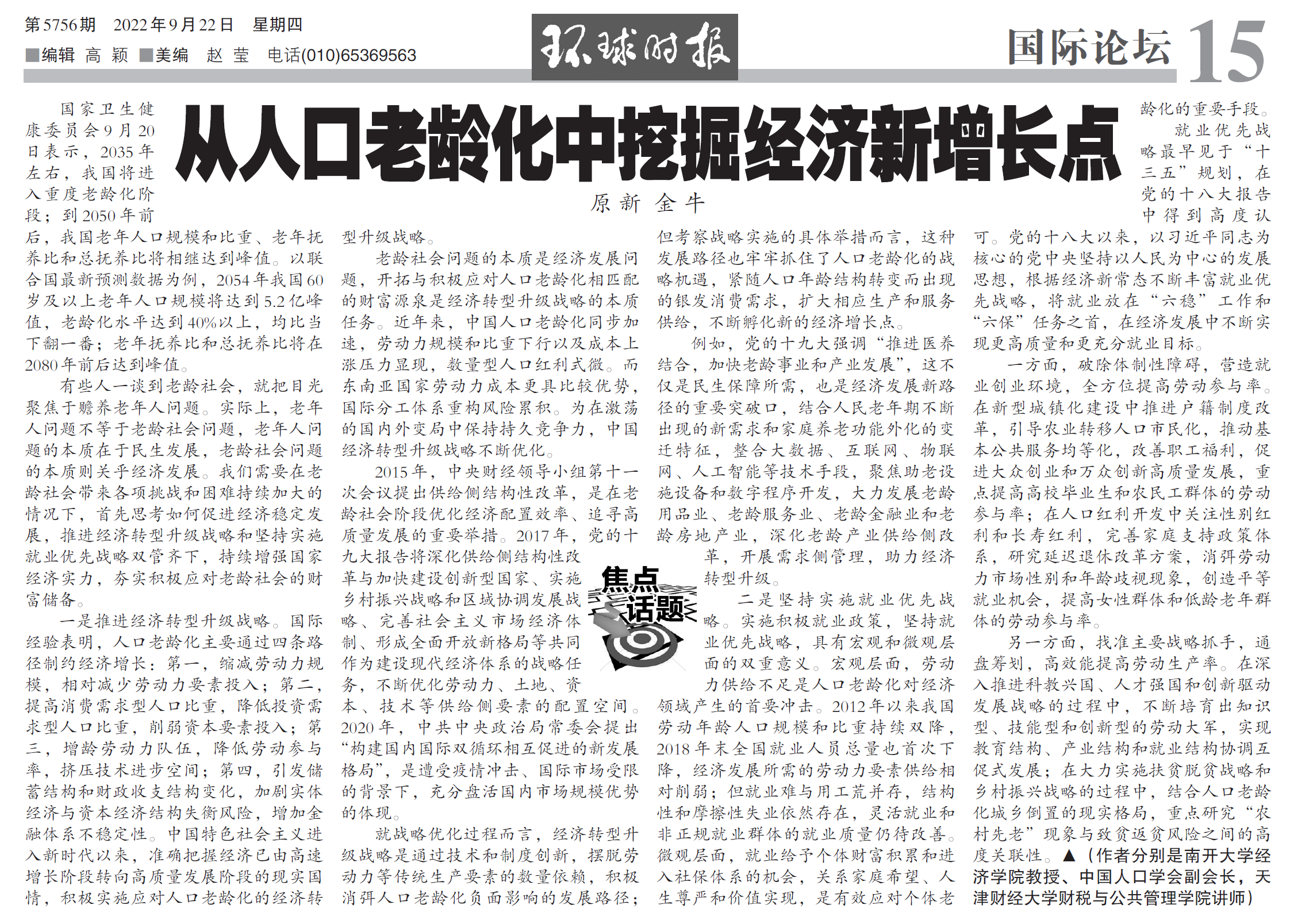 2022年9月22日,金牛博士的文章《从人口老龄化中挖掘经济新增长点》在《环球时报》国际论坛栏目刊发。该文以国家卫生健康委9月20日召开新闻发布会介绍党的十八大以来老龄工作进展与成效为背景,指出老龄社会问题不等同于老年人问题,老龄社会问题是经济发展问题,老年人问题是民生发展问题。面对我国人口老龄化程度日趋深化的发展现状和趋势,我们应该从人口老龄化挑战中寻找发展机遇,树立转危为机的应对理念,思考如何促进经济稳定发展。对此,强调一方面可以从推进经济转型升级战略出发,深化老龄产业供给侧改革,助力经济转型升级;另一方面可以从坚持就业优先战略出发,深度开发性别红利和长寿红利,推动人口红利从数量型主导向质量型和配置型主导的高质量转变。