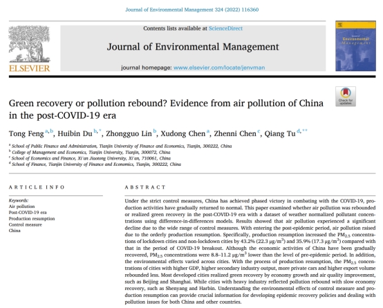 188博金宝亚洲体育冯彤的文章《Green recovery or pollution rebound? Evidence from air pollution of China in the post-COVID-19 era》发表于《Journal of Environmental Management》2022年324期。在严格的防控措施下,我国抗击新冠肺炎取得阶段性胜利,生产活动逐步恢复正常。本文通过使用气象归一化的大气污染物浓度数据集,应用双重差分模型研究了在后疫情时期空气污染是否反弹或实现了绿色复苏。结果表明:新冠疫情爆发后,由于采取了严格的防控措施,大气污染显著下降;进入后疫情时期,由于生产有序恢复,大气污染加剧。具体而言,与新冠疫情爆发期间相比,复工复产使得封城城市和非封城城市的PM2.5浓度分别增加了43.2%(22.3μg/m3)和35.9%(17.3μm/m3)。虽然我国的经济活动已经逐步恢复,但PM2.5浓度比疫情前水平仍低8.8-11.2μg/m3。此外,城市的环境影响呈现异质性,复工复产后,GDP较高、第二产业产出较高、私家车较多、出口量较高的城市PM2.5浓度反弹较少。相对发达城市实现了经济增长和空气质量改善下的绿色复苏,如北京和上海;而重工业城市经济复苏缓慢,同时出现了污染反弹,如沈阳和哈尔滨。 《Journal of Environmental Management》是SCI一区期刊,(2021)复合影响因子为8.549,ABS 3级期刊,是我校认定的高质量学术期刊。