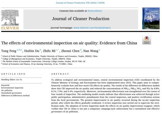 188博金宝亚洲体育冯彤的文章《The effects of environmental inspection on air quality: Evidence from China》发表于《Journal of Cleaner Production》2022年328期。为解决我国生态环境问题,由生态环境部牵头的中央环保督查(CEI)自2016年开始实施。本研究旨在评估CEI对我国空气质量的影响。通过构建3个双重差分模型评估了86个城市的空气质量改善情况。研究发现:CEI对空气质量改善有显著的正向影响,其中:PM2.5、PM10、NO2 和 SO2 的浓度分别降低了 8.8%、8.1%、7.9% 和 2.4%。此外,通过四批督察的逐步推进,环境效益得到了加强,主要得益于公众的积极参与、环保督察的严格执法和地方政府的积极整改。驻场督察期间空气质量改善最大,之后效果逐渐减弱。为督促整改,在“回头看”督察期间,空气质量改善的效果再次显现,这验证了中央环保督察不是一种临时的运动式执法,而是一种常态化、有效的大气污染治理措施。 《Journal of Cleaner Production》是SCI一区期刊,(2021)复合影响因子为11.072。