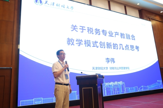 6月29日上午李伟教授以“关于税务专业产教融合教学模式创新的几点思考”为题,进行大会主旨报告,围绕我校税务专业办学历史和取得成绩、产教融合教学改革举措及成果、产教融合教学改革面临主要问题以及创新尝试,与参会兄弟院校专家学者沟通交流。6月29日下午,李伟教授参加虚拟教研室建设研讨会,就课程平台建设、资源共享以及对虚拟教研室教研功能定位同与会代表展开交流;张凯丽博士参加教学研讨第一分论坛,并作为分论坛首位发言教师,从我校《中国税制》课程设置基本情况、课程特色及取得成效、教学过程中遇到的困惑难点以及进一步教改举措几个层面,与兄弟院校教师代表进行互动交流。