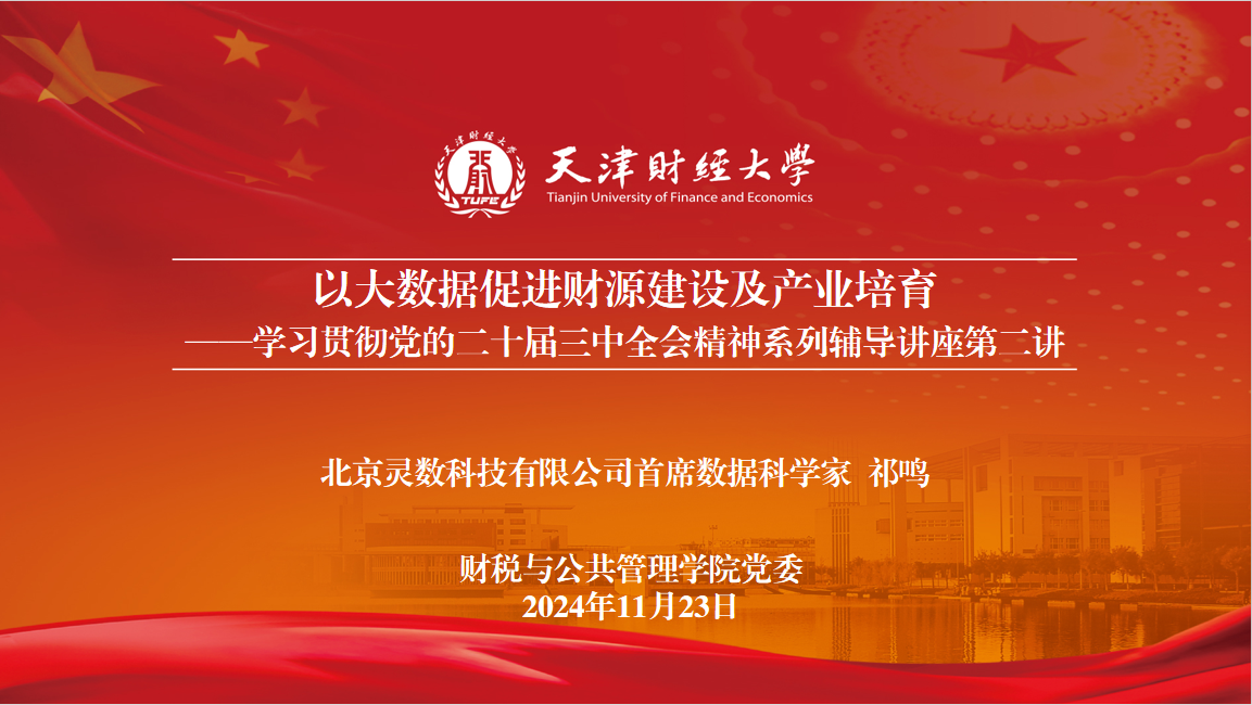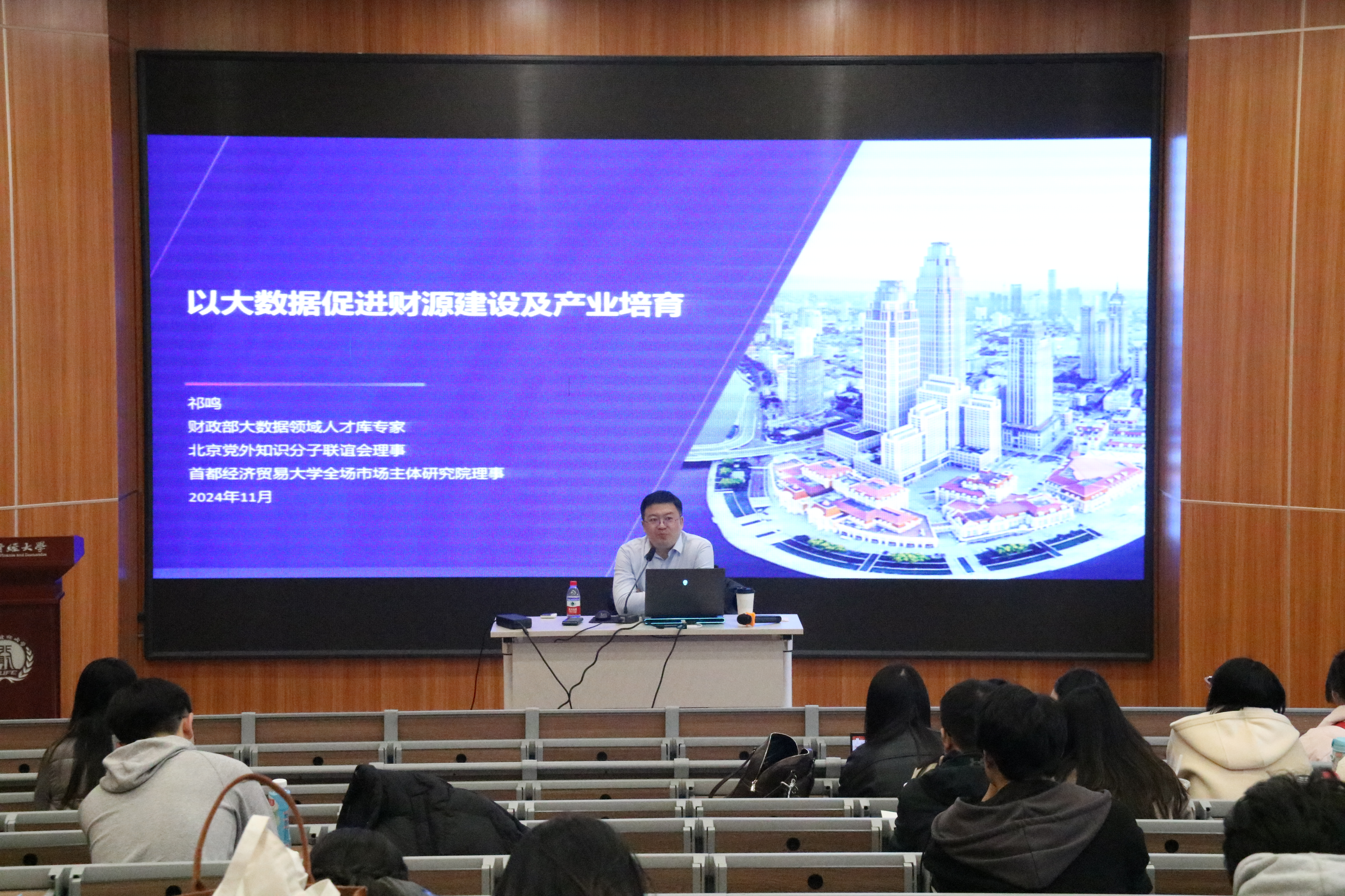 为持续深入学习贯彻落实党的二十届三中全会精神,坚持学深悟透,学有所用,将党的创新理论更好应用到经济发展实践中,11月23日学院举办学习贯彻党的二十届三中全会精神系列辅导讲座第二讲,邀请财政部大数据领域人才库专家、北京党外知识分子联谊会理事、首都经济贸易大学中国市场主体研究院理事祁鸣老师,为188博金宝亚洲体育师生作主题为“以大数据促进财源建设及产业培育”的专题报告。本次讲座由188博金宝亚洲体育财政系教师党支部副书记李宛姝老师主持,学院师生近百人参与本次讲座。