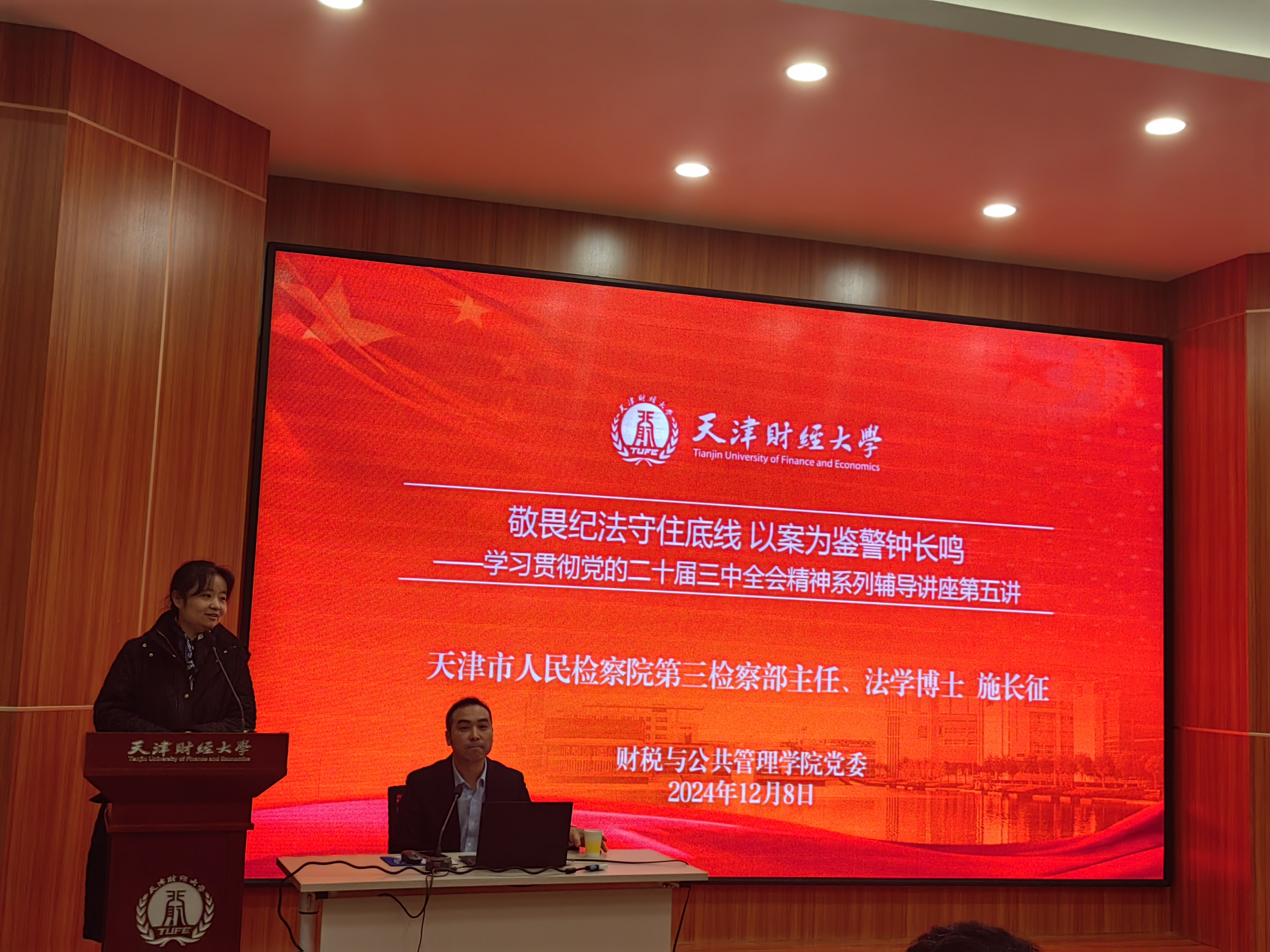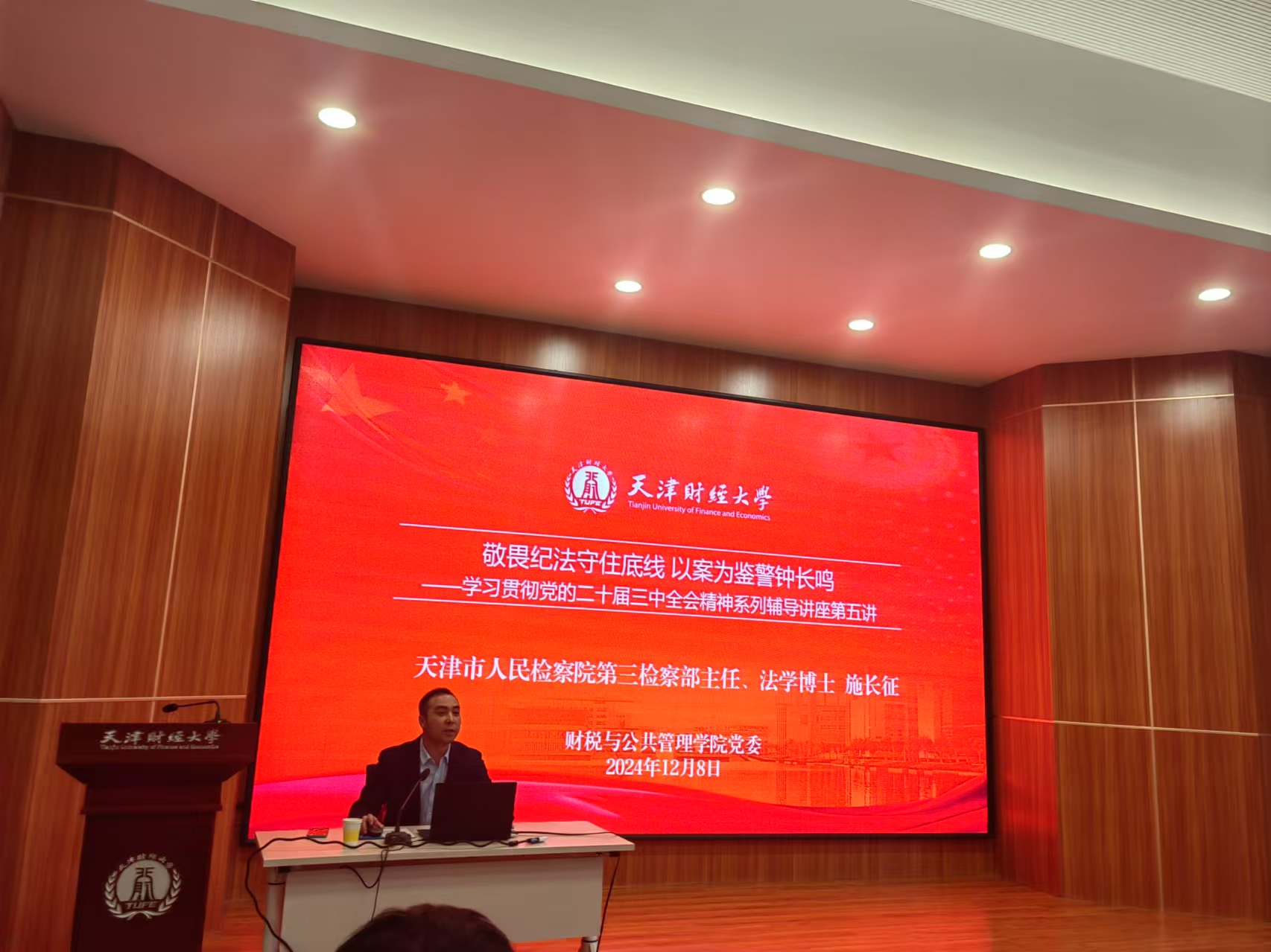 党的二十届三中全会对深入推进党风廉政建设和反腐败斗争作出重要部署,为深入学习贯彻落实党的二十届三中全会精神,让党员干部知敬畏、存戒惧、守底线,12月8日下午,学院举办学习贯彻党的二十届三中全会精神系列辅导讲座第五讲,邀请天津市人民检察院检委会委员、第三检察部(职务犯罪检察部)主任施长征博士做客“天财MPA讲坛”,为188博金宝亚洲体育师生做主题为“敬畏纪法守住底线 以案为鉴警钟长鸣”的专题讲座。本次讲座由188博金宝亚洲体育党委书记、院长陈旭东教授主持。学院党政领导班子成员、部分教师代表和MPA学生参会。