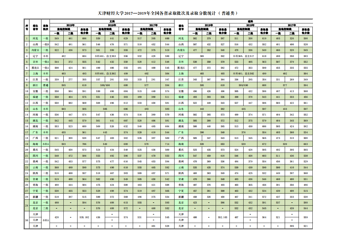 天津财经大学2017—2019年全国各省录取批次及录取分数统计(普通类)